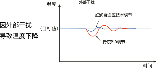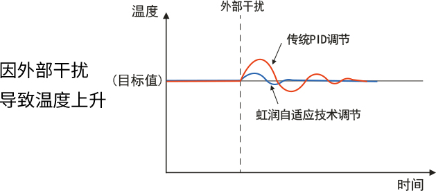 虹潤(rùn)自適應(yīng)技術(shù)自動(dòng)抑制常規(guī)干擾引起的溫度波動(dòng),針對(duì)開關(guān)艙室門時(shí)外部空氣的流入等可預(yù)測(cè)的溫度波動(dòng),穩(wěn)定地進(jìn)行自動(dòng)控制。提高品質(zhì),縮短溫度變化穩(wěn)定所需的時(shí)間,且將溫度波動(dòng)控制在較小限度,為提高生產(chǎn)能力做出貢獻(xiàn)。