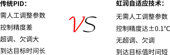 虹潤(rùn)自適應(yīng)控制技術(shù)可自動(dòng)整定出較佳PID值。監(jiān)視裝備的溫度控制狀態(tài),自動(dòng)調(diào)節(jié)PID值,對(duì)工件變化及裝備變化、環(huán)境變化等進(jìn)行較佳溫度控制。