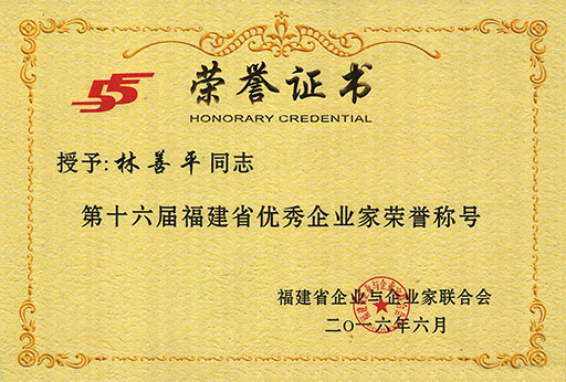 為弘揚(yáng)優(yōu)秀企業(yè)家深化改革、科學(xué)管理、與時(shí)俱進(jìn)、勇于創(chuàng)新的開拓精神,激勵(lì)廣大企業(yè)家敢為天下先、愛拼才會(huì)贏的闖勁,為推動(dòng)福建省產(chǎn)業(yè)轉(zhuǎn)型升級和經(jīng)濟(jì)持續(xù)健康發(fā)展建功立業(yè),近日,福建省企業(yè)與企業(yè)家聯(lián)合會(huì)組織開展了每兩年評選一次的福建省優(yōu)秀企業(yè)家評選工作,并于2016年6月24日決定授予98位企業(yè)經(jīng)營管理者“第十六屆福建省優(yōu)秀企業(yè)家”榮譽(yù)稱號,虹潤公司董事長林善平榮獲該榮譽(yù)稱號。