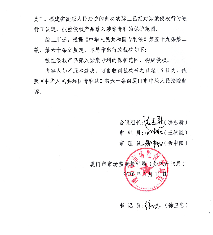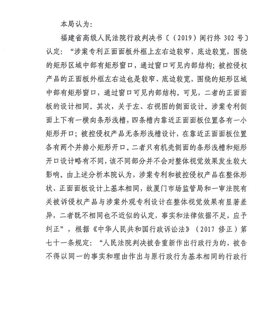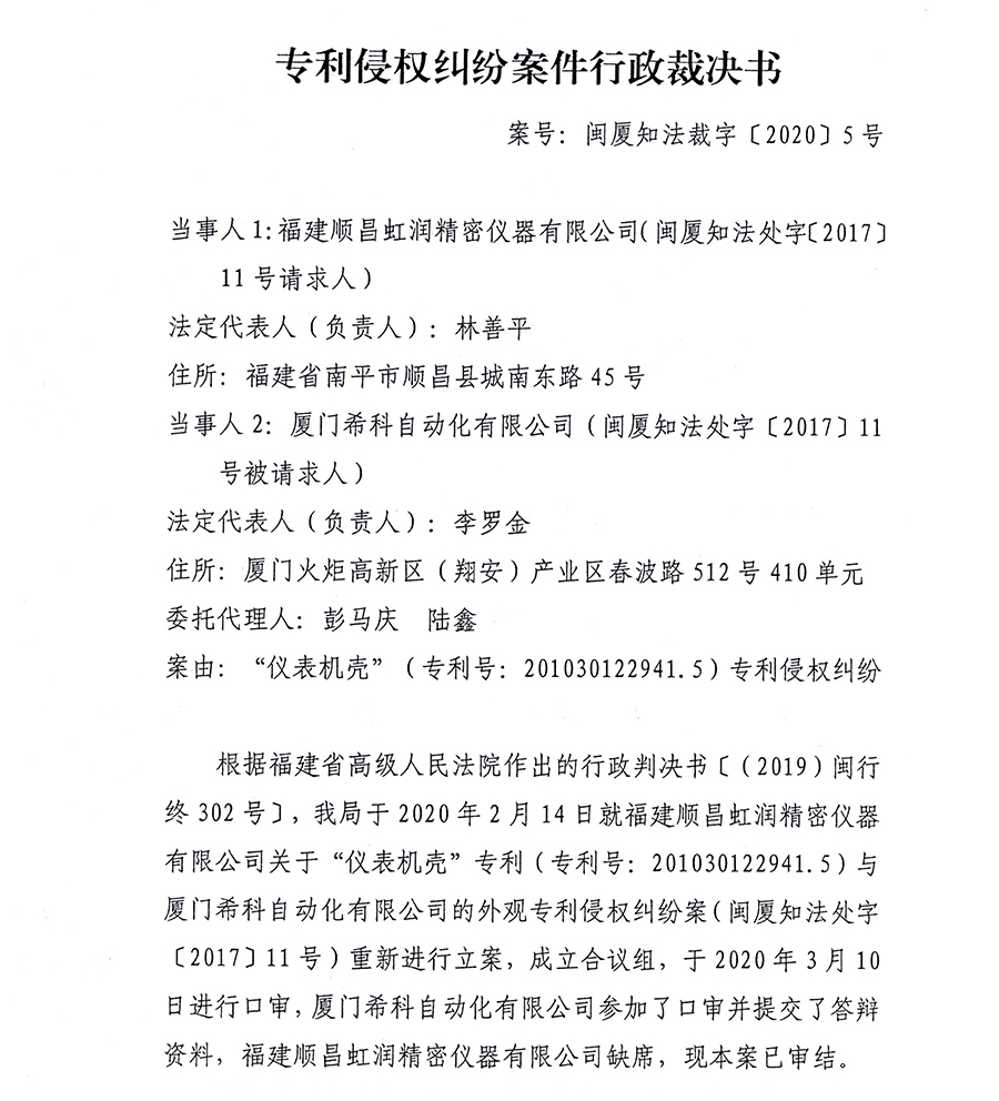 根據(jù)福建省高級(jí)人民法院作出的行政判決書[(2019)閩行終302號(hào)],廈門知識(shí)產(chǎn)權(quán)局于2020年2月14日就福建順昌虹潤(rùn)精密儀器有限公司關(guān)于“儀表機(jī)殼”專利(專利號(hào):201030122941.5)與廈門??谱詣?dòng)化有限公司外觀侵權(quán)糾紛案(閩廈知法處字[2017]11號(hào))重新進(jìn)行立案,于2020年3月10日作出審結(jié)裁決,認(rèn)定廈門希科被控的無紙記錄儀侵權(quán)產(chǎn)品落入涉案專利的保護(hù)范圍,構(gòu)成侵權(quán)。
